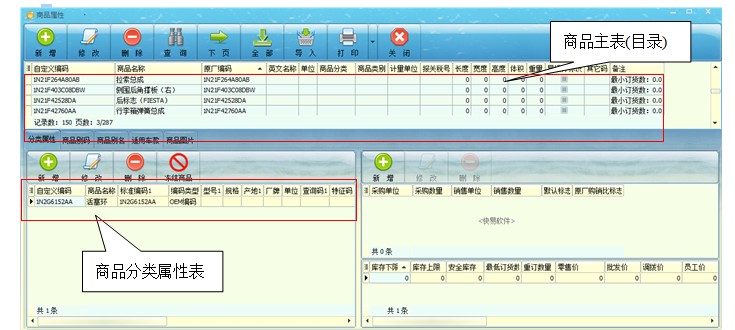 在快易汽配中商品属性是有主次的,主表就好像是字典的目录,通过目录就可以缩小查询范围,迅速定位到要查找的商品,而且在销售时可以将同一商品目录的商品进行同列,方便销售人员报价,其具体实现将在下面销售分析中说明。