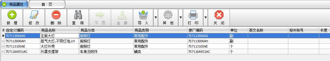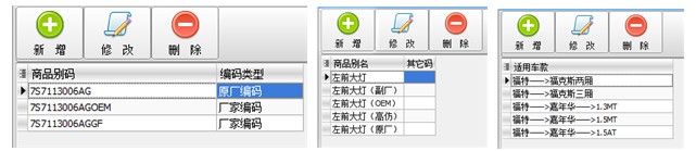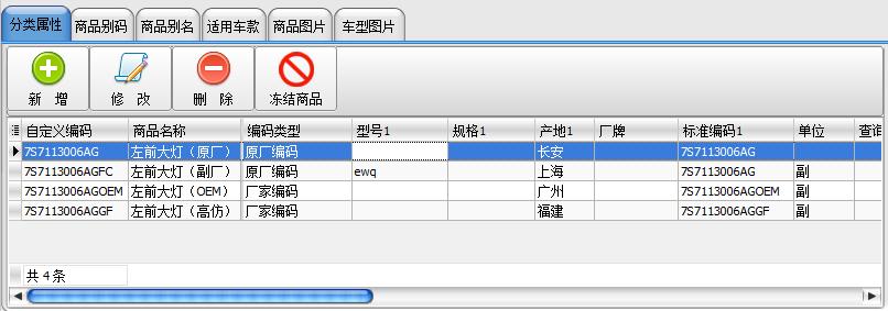 这是因为同一种商品,它们的属性是存在差异性的,在汽车配件这个行业中同一商品的差异性就更为明显。在主表中我们定义的是一种商品的共同属性,它代表了这一商品的唯一性,等同于商品的目录。而在分类属性表定义的是这一种商品必须通过独立编码来区分的差异属性。例如:所有适用于福特车的“左前大灯”这一种商品,虽然它们外形一样、功能一样,适用车型一样,但由于厂家的不同而区分为原厂件、OEM件、副厂件、高仿件等。这样我们可以在主表建立一个福特车“左前大灯”的商品目录,然后在分类属性表里建立原厂件、OEM件、副厂件、高仿件等要加以区分的具体商品。