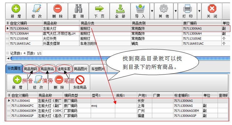 我们除了可以通过商品目录的字段内容来查找外,还可以通过商品别码、商品别名、适用车款来查找,就好像小学生通过拼音、偏旁和笔画来查字典一样的道理。