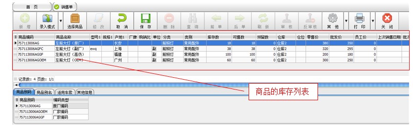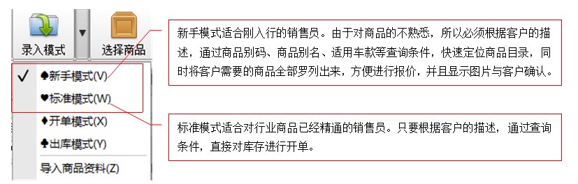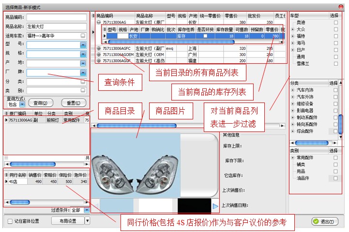 快易汽配在设计销售单时,定义了三种选择商品的操作模式,适合于行业经验在不同层次的使用者达到快速定位商品的能力。