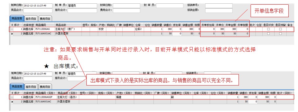 注意:如果用户没在出库模式下修改过的话,默认销售商品与出库商品是一致的,如上面两个图中的“外罩支撑架”。