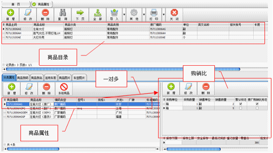 用户首先要建立商品资料后才能创建购销比信息,商品目录与分类属性(商品属性)是一对多的关系;分类属性(商品属性)与购销比也是一对多的关系。商品属性的详情请参阅“商品属性与销售的关系”。