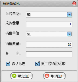 默认标志是表明当前购销比是该商品的默认包装规格,在采购和销售该商品时,系统会自动套用这个购销比来进行换算,除非您在采购单和销售单中改变该商品的购销比。