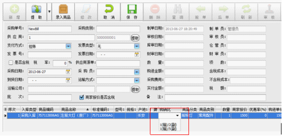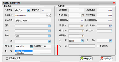 以上图为例,采购时:商品“左前大灯(原厂)”;购销比1(箱)/5(副);数量为1箱;购进单价为1500元,保存入库存表时数据将变为:商品“左前大灯(原厂)”;购销比1(箱)/5(副);采购数量为5副;购进单价为300元。