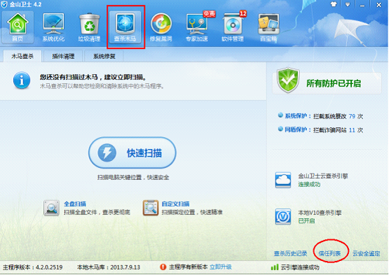 先打开金山卫士主界面,再选择查杀木马模块,点击右下角的信任列表